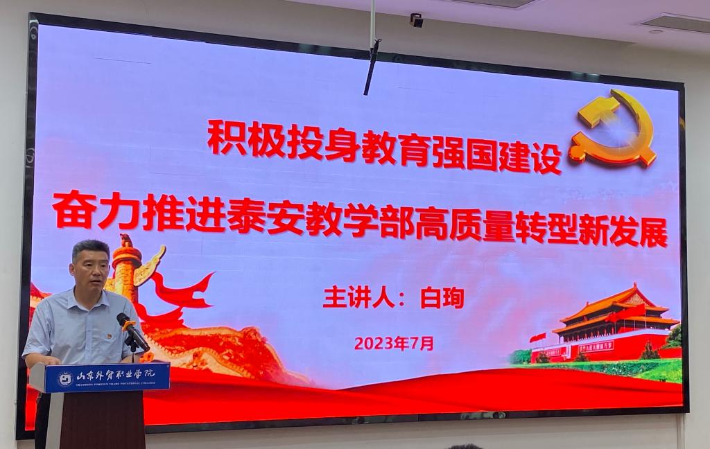 7月6日下午,泰安教学部党委书记白珣在新校区智慧教室为全体党员讲授主题教育专题党课。