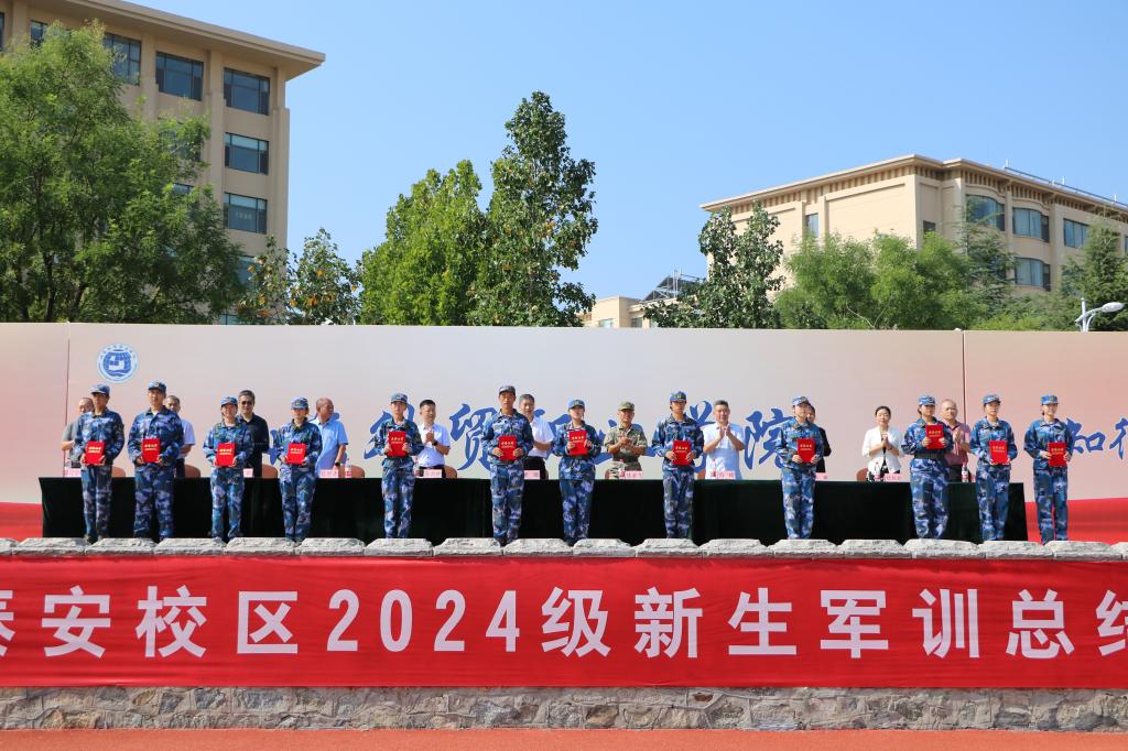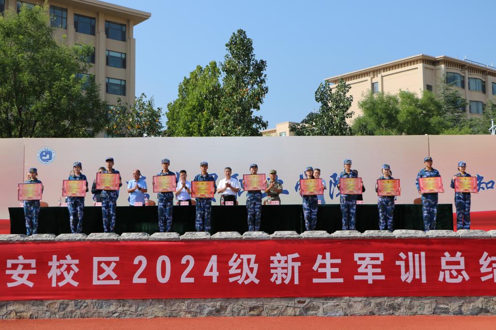 泰安教学部主任位思清宣读2024级新生军训表彰名单。此次军训共评选出5个军训优秀连队、38个军训优秀宿舍、62名优秀训练标兵和62个优秀内务标兵。与会领导为获奖的集体和个人代表颁发了荣誉证书。