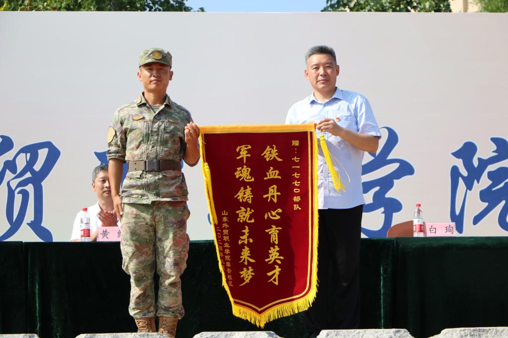泰安教学部党委书记白珣向承训部队赠送锦旗。