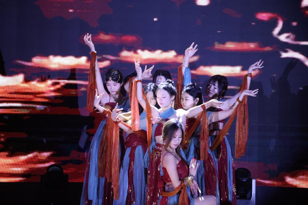 晚会分为“初遇·恰逢时”“此刻·正闪耀”“逐光·向未来”三个篇章,包含歌曲、舞蹈、相声、音乐剧等15个形式多样、各具特色的节目。晚会在活力四射的开场舞《Gee》中热烈开场,瞬间点燃了现场气氛。歌曲《我相信》、《你从未离去》旋律动人,唱出了学子们追逐梦想的坚定信念;舞蹈《River》、《沁莲》各展风采,展现出多元舞蹈风格的碰撞与交融;说唱《岁序新Flow》节奏明快、充满力量,彰显了当代青年的个性表达;朗诵《回望浴血路青春赴征程》、《新程有光青春不打烊》语调铿锵、感情真挚,学子们以昂扬之态诠释责任担当,勾勒对未来的美好憧憬;汉服表演韵味悠长,呈现出传统服饰与古典舞蹈的独特魅力;相声《欢声笑语》妙语连珠,引得台下笑声与掌声不断;cos表演造型惊艳,点燃了全场观众的二次元热情;晚会还特别设置了年度优秀学生表彰环节,对2025年在各项专业竞赛、社会实践等方面表现突出的同学予以嘉奖,以榜样力量引领前行。晚会最后,全体演职人员共唱《相亲相爱》,将现场气氛推向高潮,也为整场晚会画上圆满的句号。