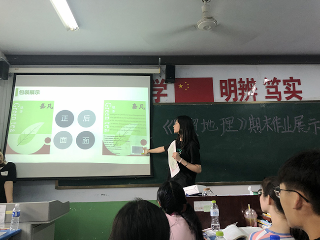 教研室主任宁莉率先尝试,她在《外贸综合实训》中,通过设定项目、布置任务的方式,要求学生选取国际贸易流程中的某一具体环节,组队录制视频,模拟外贸真实情景,进行展示;在《国贸地理》课程中,要求学生借助PPT的形式,充分结合地理知识中不同市场的国别特色设计一款商品及其logo和包装,学生积极参与其中,态度认真,热情高涨,气氛浓厚。