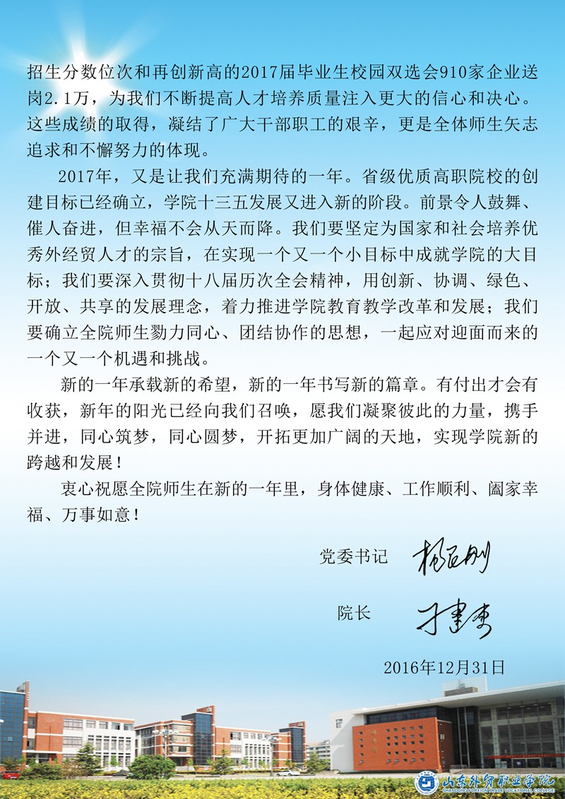 党委书记杨民刚 院长刁建东2017新年贺词