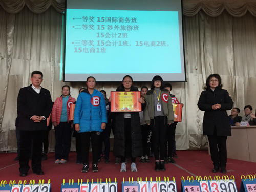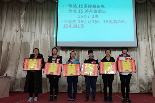 参加竞赛的班级有2015级涉外旅游专业、会计专业、电子商务专业及国际商务专业。竞赛本着公平公正的原则,严格按照评分标准进行评判,现场打分、当场亮分,比赛现场井然有序,学生参与积极性高涨。经过初赛和决赛两轮角逐,2015级国际商务班荣获一等奖, 2015级涉外旅游班、2015级会计2班荣获二等奖,2015级会计1班、2015级电子商务2班、1班荣获三等奖。学院副院长魏玉、管委会副主任白珣为获奖班级颁奖。