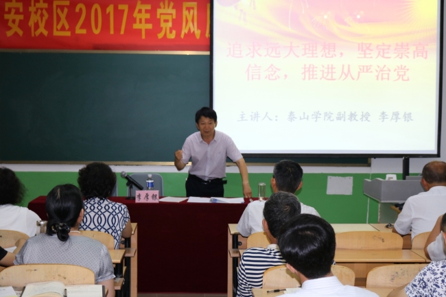 6月29日下午,校区在三号多媒体举办了从严治党专题讲座。校区党委委员及三个支部共50余名党员参加活动。该活动是校区开展的庆“七一”系列活动之一。讲座特邀请泰山学院马克思主义学院副院长、副教授李厚银主讲。