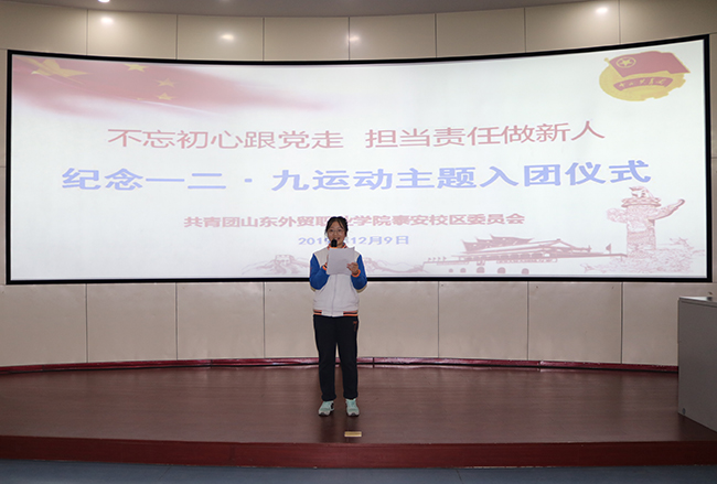 校区团员发展严格按照团中央发展团员工作的规定,把从严治团要求落到实处,严把“入口关”。本期新团员经过个人申请、班级审核推荐、8学时的培训、考试和考察等,共有61名同学光荣加入团组织。入团仪式以“不忘初心跟党走,担当责任做新人”为主题,在“一二·九运动”84周年的特殊日子里,开展入团仪式,激励全体团员热爱伟大祖国,坚定理想信念,听党话跟党走,铭记自己作为新时代团员青年肩负的责任与使命,努力拼搏,砥砺奋斗,为团组织、为学校增光添彩,为实现中华民族伟大复兴的中国梦贡献青春智慧和力量。