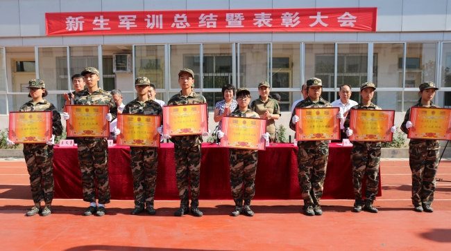 校区管委会副主任位思清宣读表彰决定,对孔玉文等8个内务标兵、吴金朋等30个训练标兵及军训标兵班级、军训先进班级、礼节礼貌优秀班级和内务整洁优秀班级进行表彰,与会领导为获奖个人和集体颁奖。